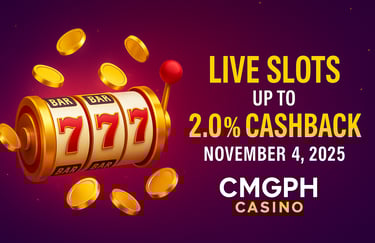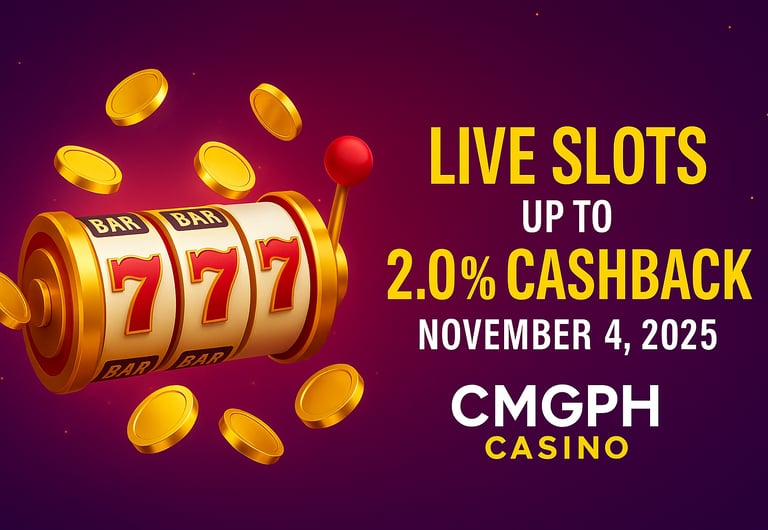 Get ready to elevate your slot gaming excitement this November 4, 2025, as CMGPH CASINO brings you the Live Slots Up To 2.0% Cashback Event! Designed for players who love fast-paced action and real rewards, this limited-time offer gives everyone a chance to spin, play, and earn cashback with every game.